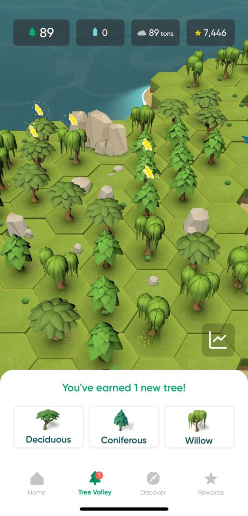 You then get to plant this tree in your symbolic โ€œtree valleyโ€ to see your impact grow. Choose between a willow, a coniferous, and a deciduous tree. You can even decide how to design your environment (Iโ€™m in the middle of making a second lake).