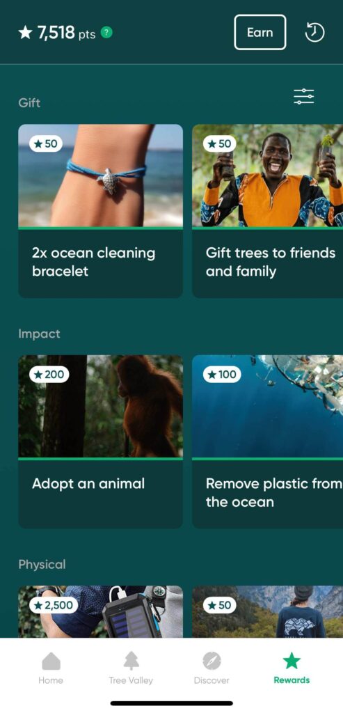 As a reward, you receive 50 points which can be collected and redeemed for experiential or tangible planet-friendly rewards. The rewards are separated into different categories so you can choose which ones speak to you. Here are some examples from the different categories: