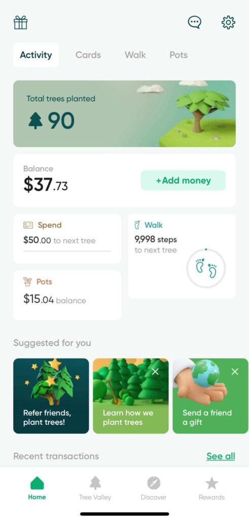 Although Treecardโ€™s main focus is bringing in money through merchant transaction fees when people use their debit card (which is very cute, by the way), this walking function acts as an easy option for those who want to quickly start making a difference in the climate movement without making a huge change to daily routine. Walking is encouraged, because when you walk, you arenโ€™t using other carbon-emitting forms of transportation.